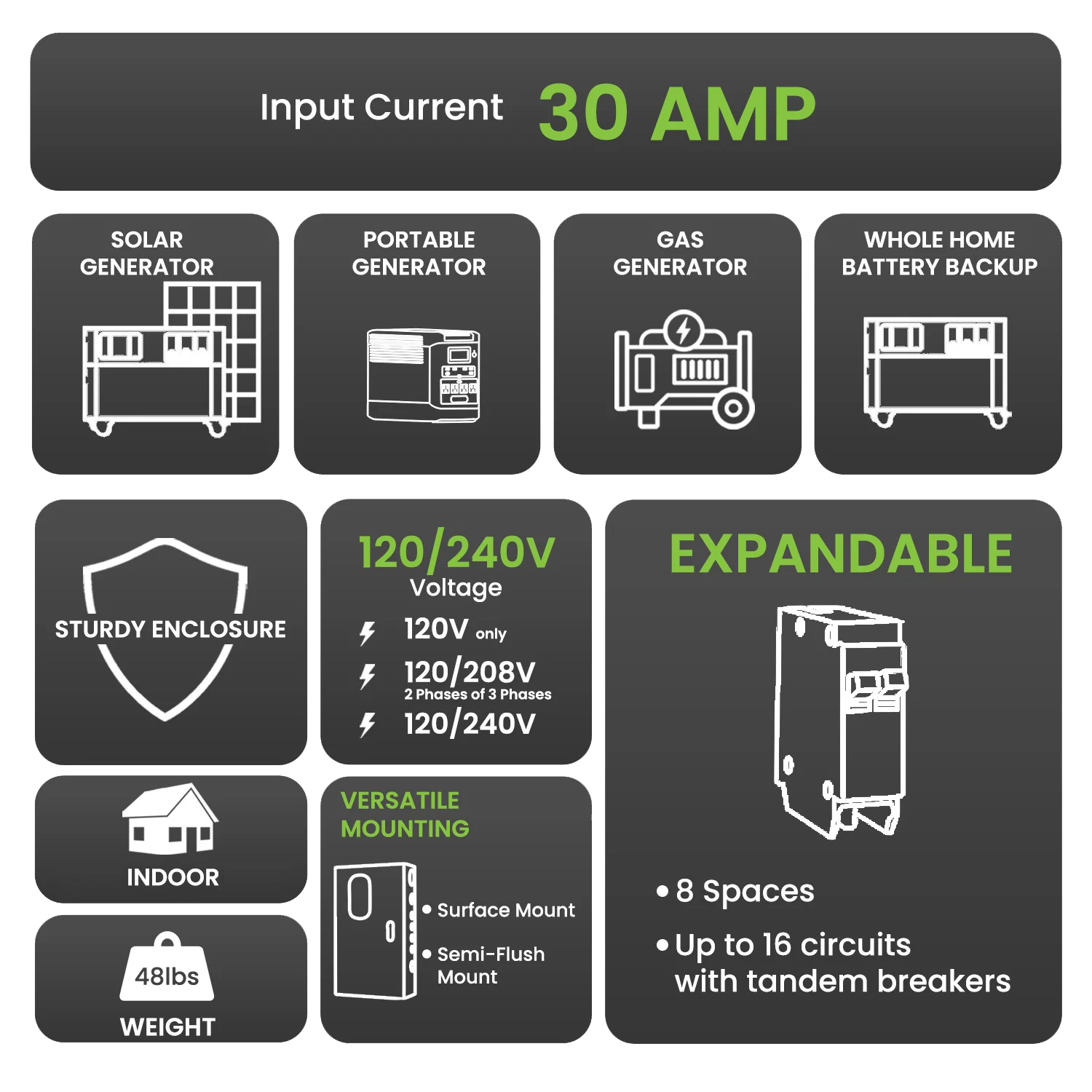 Find all the essential technical details of your automatic transfer switch, including amperage, voltage compatibility, and installation features.