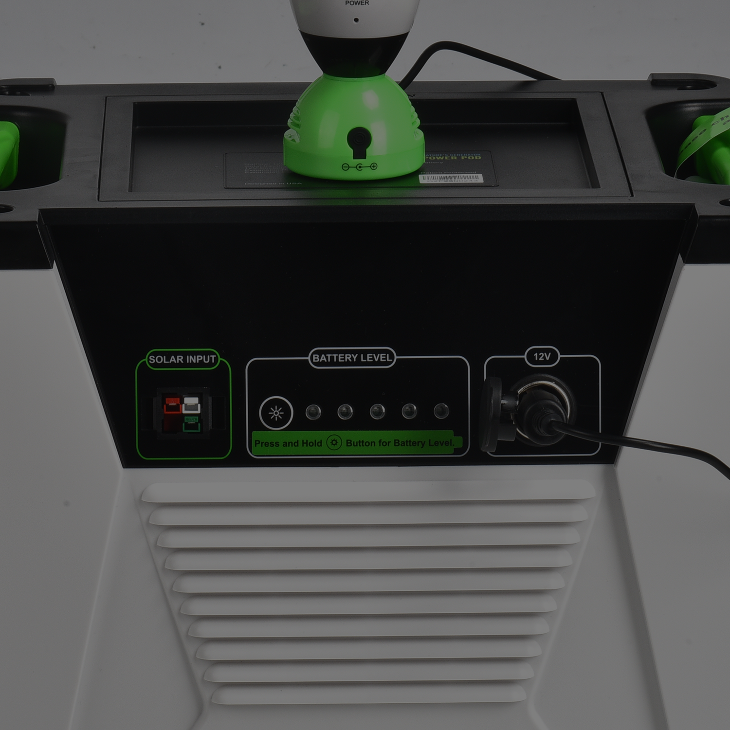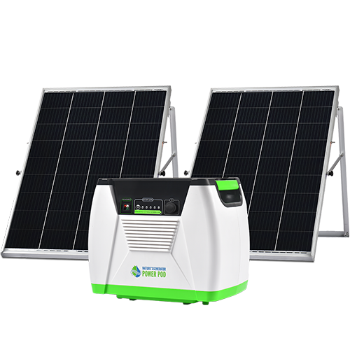 Our Nature's Generator has an 1800W inverter, 3 120V AC outlets, 2 USB ports and an LCD screen that shows data. The Power Pod compliments the Nature's Generator as an additional battery pack for more run time.